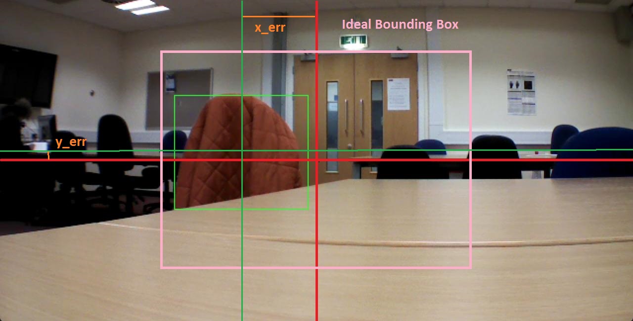 确定边框离所需位置的水平距离。在我们的例子中,这应该是正的,这意味着机器人应该向左移动,这样对象就会更接近图像的中心。盒子太小了,意味着物体太远了,等等。