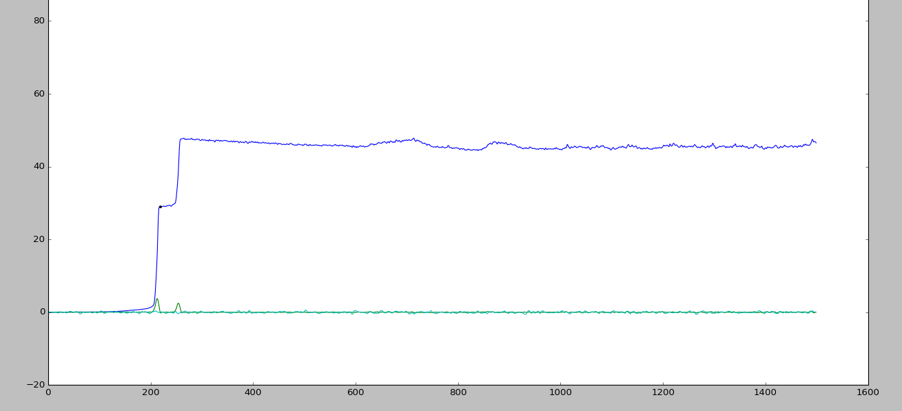 然后你可以检测到A,B和C点。它们的特点是重要和突然的变化(如此梯度)。我首先使用中值滤波器来对你的信号进行去噪,然后计算信号梯度。A,B和C将是最大梯度的三个点。