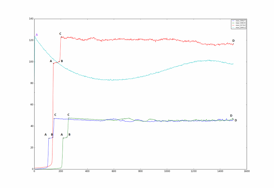 这条浅蓝色的曲线完全不同,我会从检测它开始。Fir,我将使用三个时间点(50,700和1400)。您可以看到,对于这两种曲线类型(蓝色、绿色、红色和浅蓝型),{##**$$}={##**$$}={##**$$}两种类型的曲线都是完全不同的。