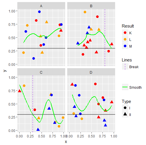 正如您将注意到的“线”图例有垂直和水平线在每个项目,在第一种情况下有几条虚线,而在第二种情况下有几条实线。我正试图调整我的代码,以生成一个图例,其中(1)有一条水平绿色线,旁边有一个名为“平滑”的键;(2)一条垂直紫色达赫兹线,旁边有一个名为"Break“的键。我希望得到一些帮助,因为无论我尝试了什么(包括linetype内部/外部aes()等,或者使用scale_linetype_identity(),甚至guides中的override.aes选项),我都找不到正确的组合!