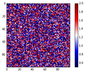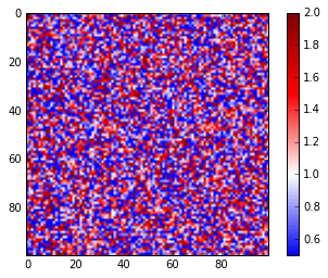 我有一个2D数据集,值在0.5到2之间。我想用imshow和seismic彩色地图来显示它,但我需要值1来匹配白色。