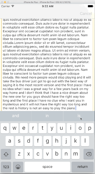 但是,当用户输入文本行时,单元格不会更新其高度,即使文本视图本身确实更新了其内部内容大小。据我所知,手动请求的唯一方法是表视图调用beginUpdates()和endUpdates()。然后正确更新单元格的高度,但这也会导致重新布局整个表视图。这是(别人的) 演示问题的示例代码。
