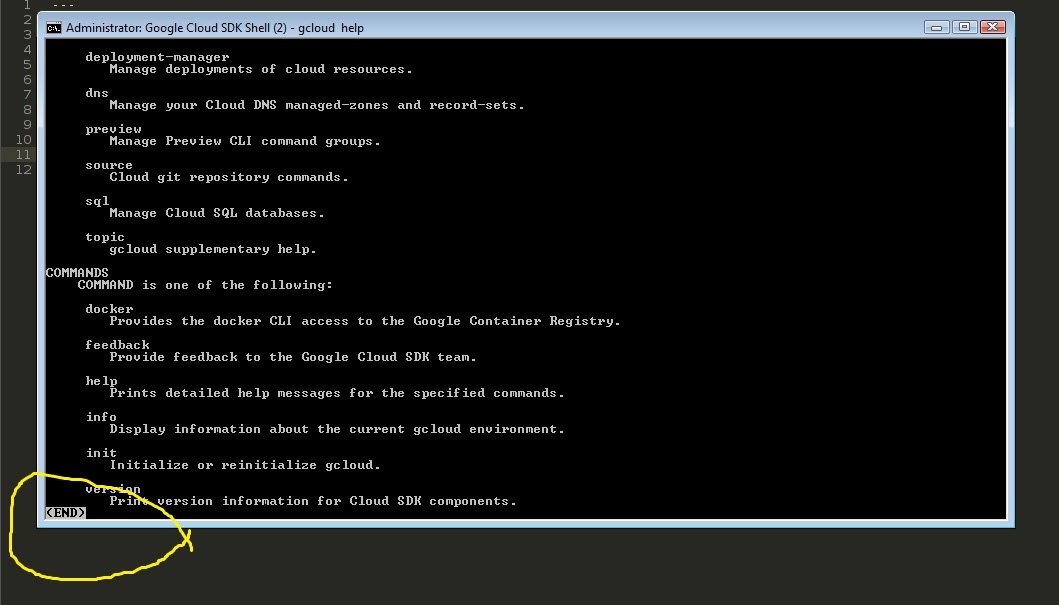 我在窗口上使用gcloud终端。只运行gcloud帮助,它显示了所有可用的命令,最后显示了一个显示(END)的提示符。但从那以后,我无法退出这个提示,继续前进。我试过Ctrl+C,Ctrl+Z。但没有用