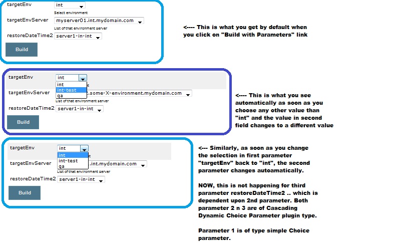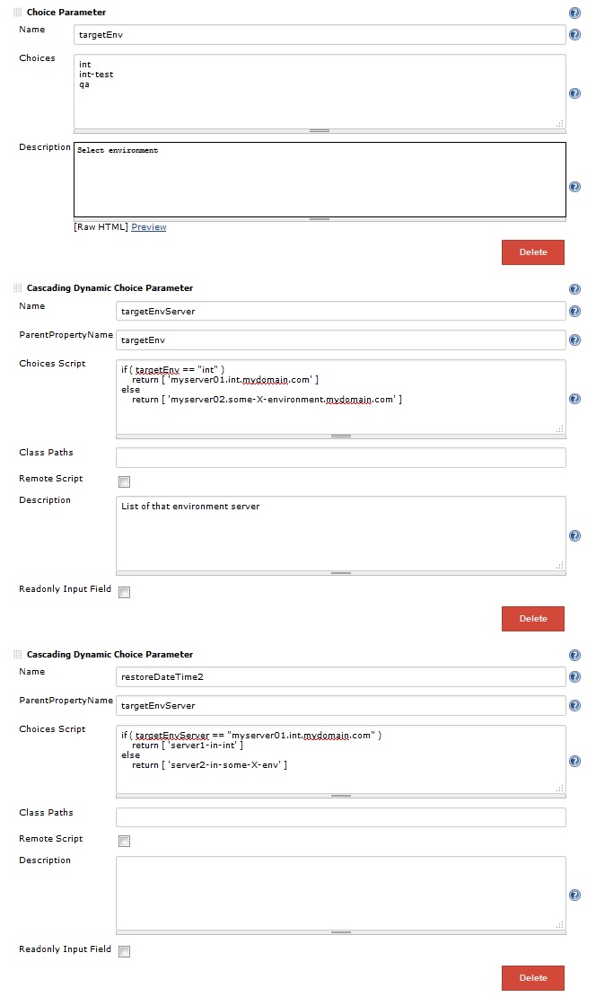 在Jenkins中,可以使用级联动态选择参数插件,即,如果targetEnvServer是一个简单的选择参数(假设参数名为targetEnv),则选择值为int、qa、int-test等,如果我选择'int‘值,则可以使用级联动态选择参数来调整ex:的第二个参数的目标值,使其在运行时仅为'int’环境设置。