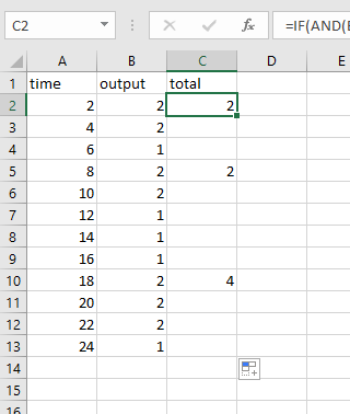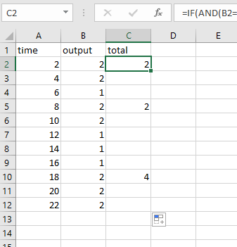 我有一个excel文件,包含两列时间和输出。输出列由两个值1和2组成。我想使计算出的总时间输出2在连续状态下最后一次,即结束时间-start时间。例如