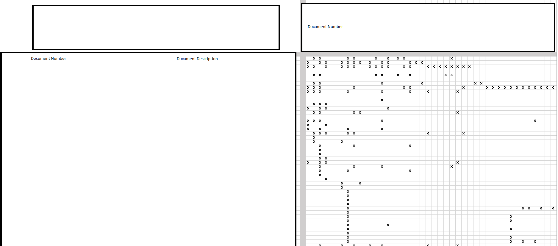 我有一个带有交叉引用的Excel电子表格,它在行和列中有文档编号,而当一个文档引用另一个文档时,我在与两者对应的单元格中放一个小X。
