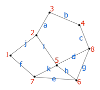 5->8, 6->8, 4->8。现在,定义一个置换,其中v->w映射到包含w->v的列表中的w->v后面的半边(如果必要的话)。这个排列的循环是多边形。