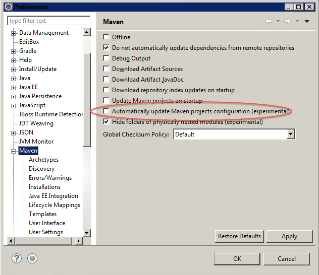 如果您希望每次更改pom时都自动更新Eclipse项目配置,那么在Preferences > Maven下面有一个(实验性)设置。但请注意,这样做可能并不可取--正如此功能请求中所提到的,这是一个涉及到Eclipse中大量内容的有点长的过程;在每个pom.xml更改中自动执行该操作可能会带来比它更大的麻烦。