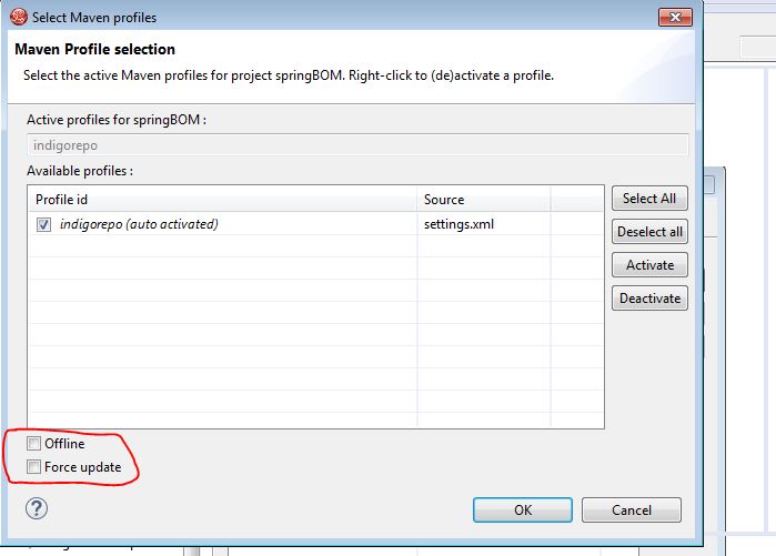 我正在使用Eclipse和Maven (v3.3)。当我更新pom中的依赖项(更改版本)时,Eclipse项目即使在右键单击我的项目并选择“Maven”->“update”时也不会选择它。我之所以知道这一点,是因为我没有看到Eclipse编辑器中的编译错误,当我在命令行上使用