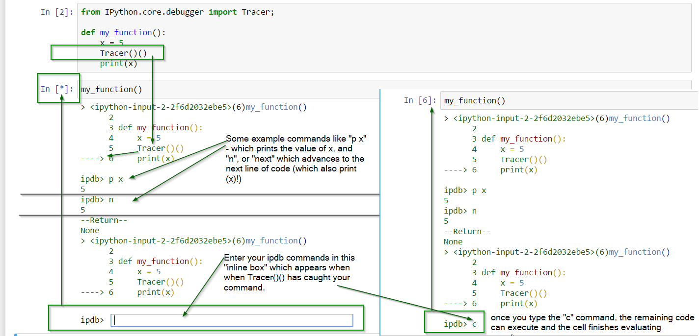 如果使用朱庇特笔记本,请使用神奇命令“%%调试”开始您的单元格。然后,在单元格底部显示ipdb行,这将帮助您在调试会话中导航。下面的命令将帮助您开始工作: