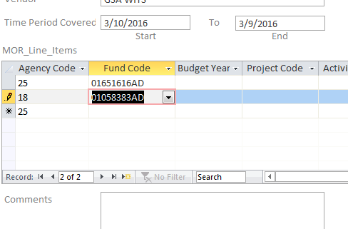 下面的数据表子表单在每个单元格中都有一个组合框。如果在左边的一个单元格中选择一个新值,则右边的单元格需要请求并设置为null (因为右边的组合框被左边的单元格过滤)。如果数据表中只有一行,则我的代码运行良好。但是,如果有多个,那么我的代码会将所有的组合框重置为右边的所有行(这很糟糕)。我需要更改我的代码(在下面列出),以只重置与选择的组合框相同行上的字段?