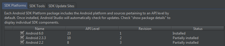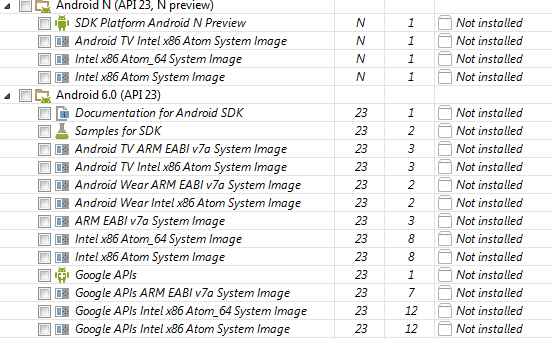 我有sdk 8,10和23。但是在avd管理器中,只显示了8和10的sdk: