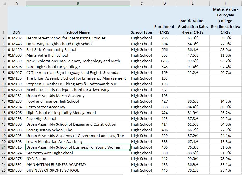 我正在用纽约的学校质量报告做一个项目。每年,他们都会发布如下的学校级别数据: