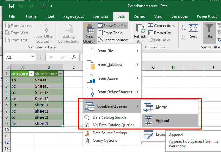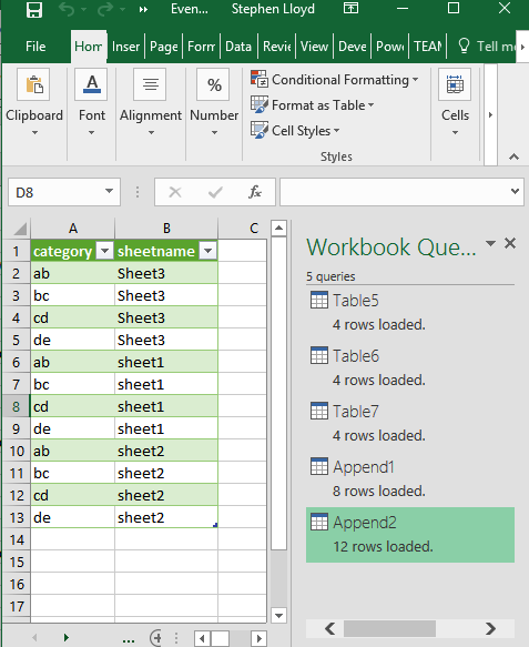 您可以使用PowerQuery从同一个工作簿中的其他工作簿或表中获取数据。在每个文件或表或其他内容中添加一个年份列(在我的示例中为sheetname来模拟)。