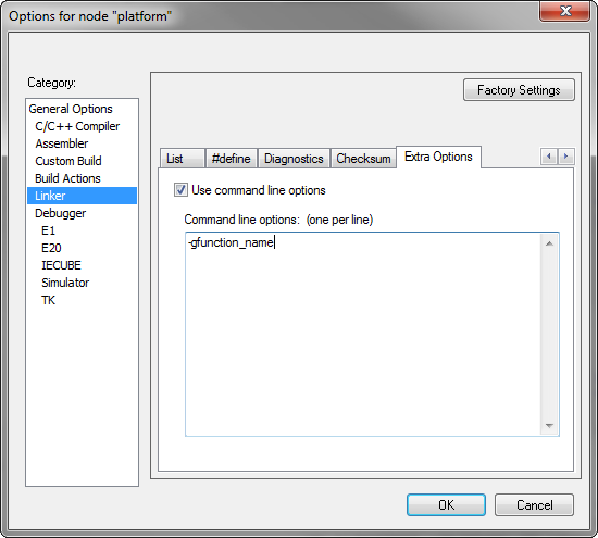 function_name我的目标是在目标系统上执行这些函数的单元测试,所以我需要将代码显示在输出ELF文件中。我如何告诉链接器保留未使用的函数?我已经尝试过将优化级别设置为None,并将模块类型设置为Program或Library。我还定义了一个名为CODE的代码段。所有这些操作都没有对链接器输出产生预期效果。