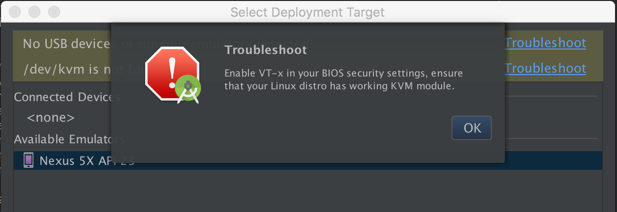 但是我注意到android工作室现在不能启动AVD。它说没有找到/dev/kvm。在bios安全设置中启用VT,确保您的linux发行版具有可工作的kvm模块。