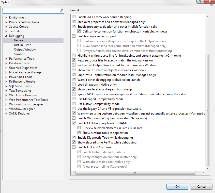 在Visual 2015更新3中,项目属性中再次包含Enable Edit & Continue。