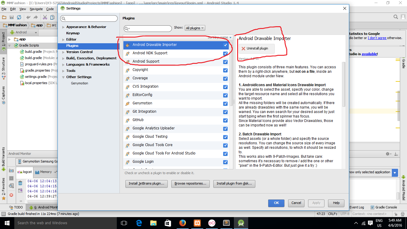 安装之后,我重新启动了Android。当我在其他设置下搜索android导入插件时,我找不到它。看下面的截图。