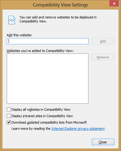 我发现这很有帮助,所以发表关于如何关闭兼容性视图:IE10 renders in IE7 mode. How to force Standards mode?的文章