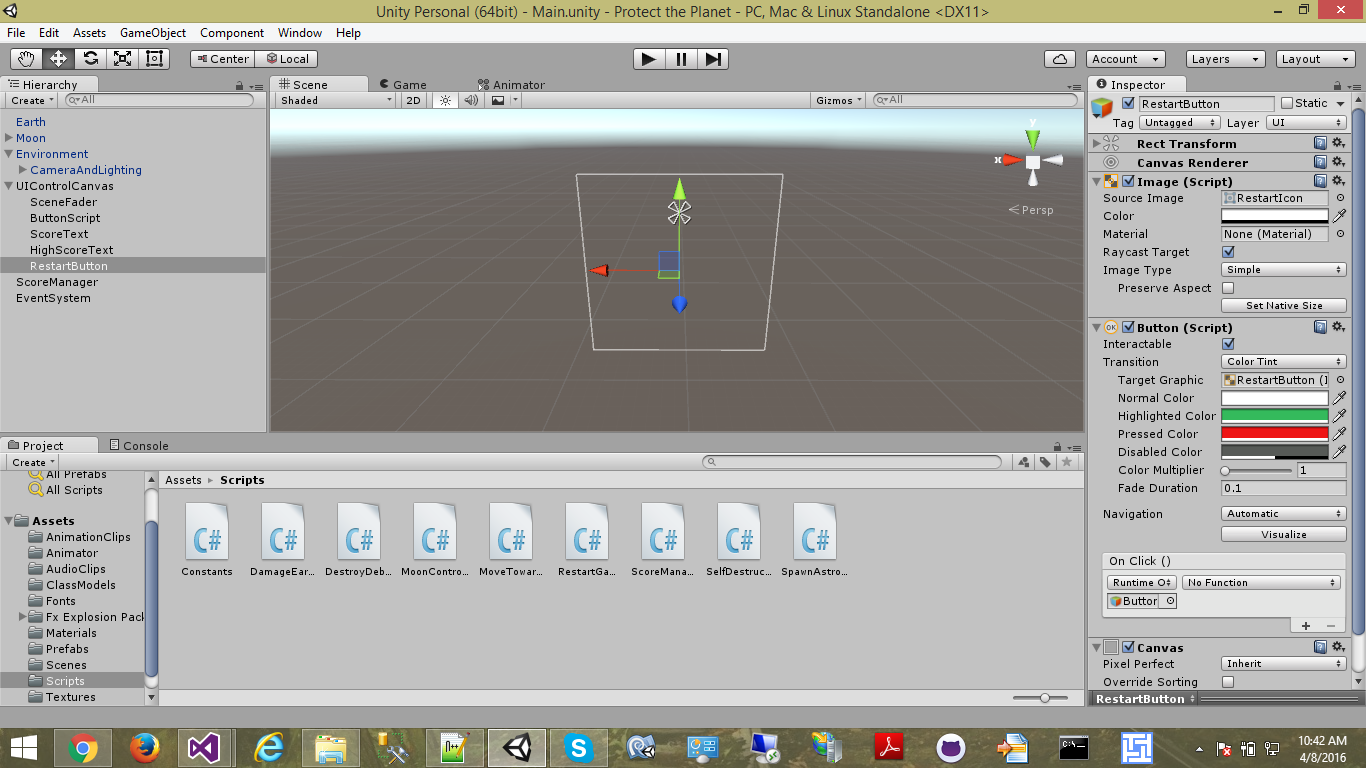 我在画布下有一个按钮,这将重新启动场景。但是它并没有调用附加脚本的预期函数。