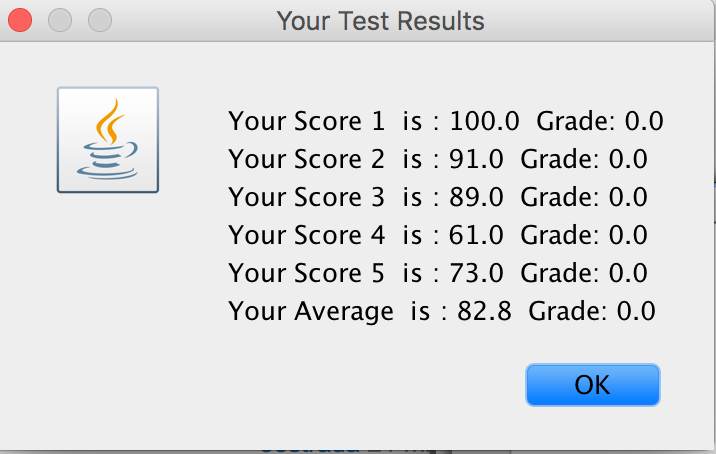 JOptionPane.showMessageDialog(null, "\t\nYour Score 1 is : " +formatter.format(Score1) +"\t Grade: " + determineGrade(Score1)