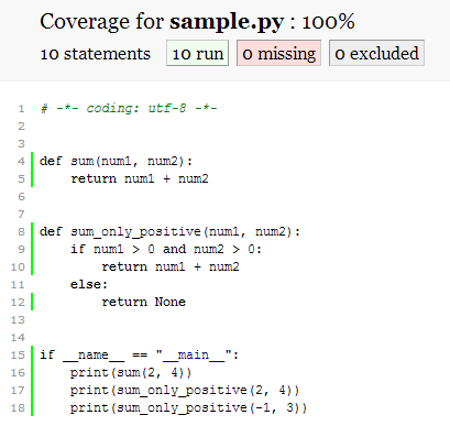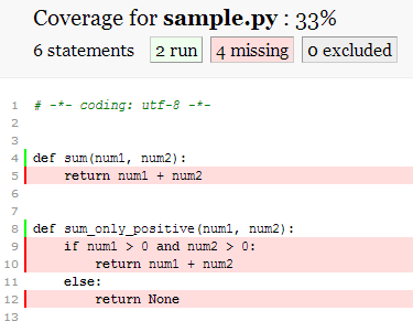 好吧,Coverage.py可能看不到test.py文件,所以我将测试函数复制到sample.py文件中,然后再次运行覆盖率: