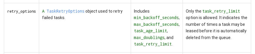 task_retry_limit 失败任务的最大重试次数。 在push队列中,每次App尝试任务时,计数器都会递增,直到指定的task_retry_limit。如果使用task_age_limit指定,App将重新尝试该任务,直到达到两个限制为止。 在拉队列中,每次租用任务时,计数器都会递增,直到指定的task_retry_limit为止。一旦任务被租出限制中指定的次数,任务就会自动删除。