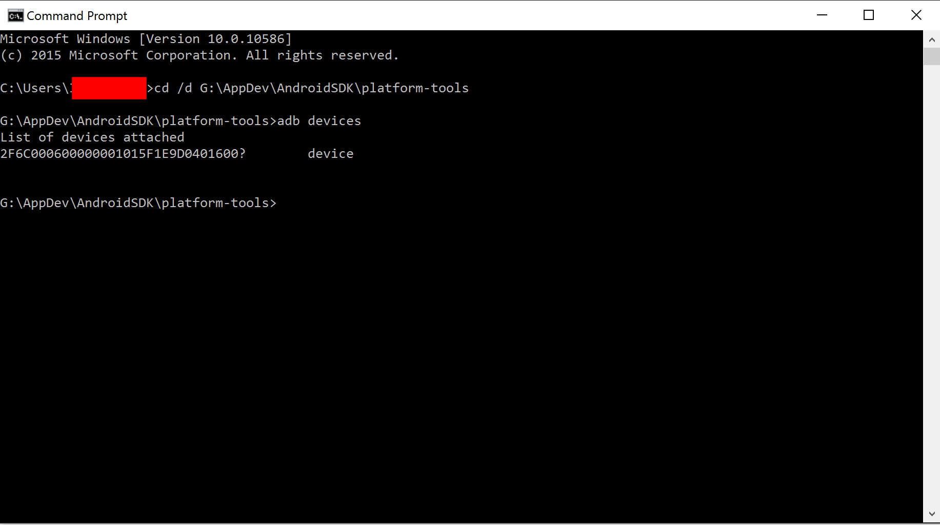 为了确保联合将使用电缆三星GearVR,它必须是可识别的团结。用cmd打开命令提示符,用cd /d G:\AppDev\AndroidSDK\platform-tools将目录更改为AndroidSDK\platform-tools。将G:\AppDev\AndroidSDK\platform-tools替换为android位置。然后键入adb devices。如果没有找到任何装置,那么团结就不会认识它。重新启动计算机,然后再试一次。