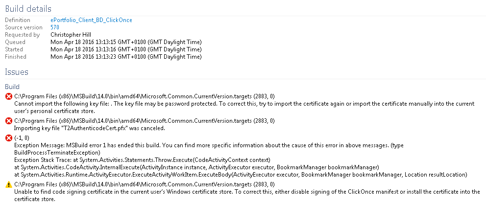 我有一个ClickOnce应用程序,它通过TFS和版本管理进行构建。我已经把它建设得很好,直到我把签名证书介绍给申请。证书可以发布应用程序,但与构建没有任何关系: