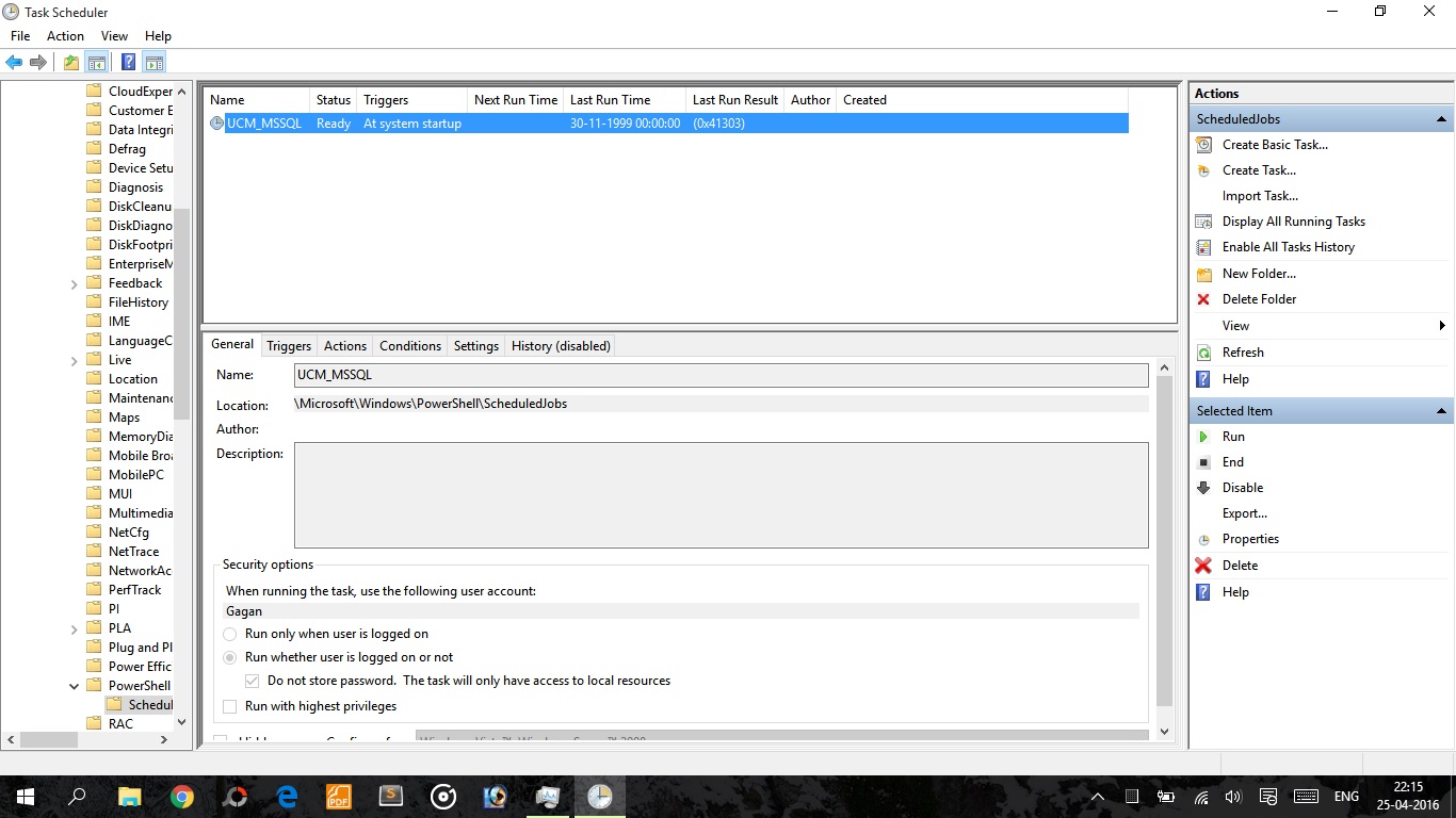 如果成功了,那就不是脚本问题了。将其分配到系统帐户,或创建一个单独的服务帐户,而不是显示的Gagan帐户。确保服务帐户在本地安全策略中具有“作为批处理作业运行的权限”。