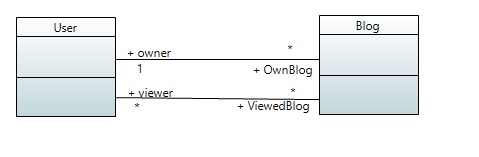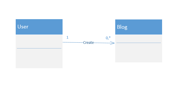要绘制类图,应该有两个类:用户类和博客类。但我很难把它们联系起来,因为这两个阶级之间的关系可能有两种不同的多重性。例如,当用户创建博客时,类图如下所示: