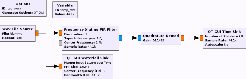 我试着用GNU无线电伴奏来解调信号。信号为FSK (频移键控),标记频率和空间频率分别为1200 Hz和2200 Hz.