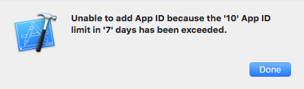 大家都知道,苹果改变了Xcode的工作方式,以至于你无法用以前使用过的应用ID创建一个应用程序,即使你只是在编写测试应用程序以供本地使用。到目前为止,我一直在输入垃圾I以避开这个愚蠢的反功能,但今天我收到了这样的欢迎:
