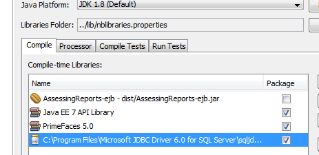 因此,与其他人一样,在最初尝试在cmd中设置CLASSPATH环境之后,我一直在研究如何将sqljdbc42.jar添加到项目中。我通过web项目和EJB模块上的Properties完成了这一工作。