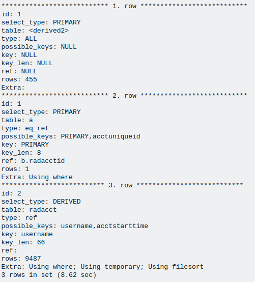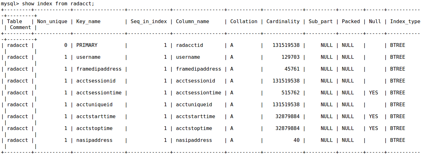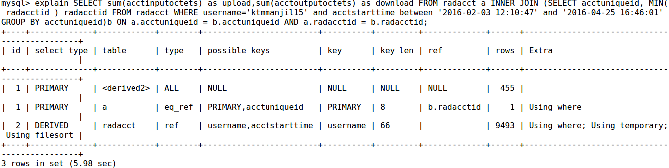 这里是一个MyISAM表,包含大约500万行数据。每5-6分钟插入大约3000名用户的数据(例如上传和下载速率、会话状态等)。