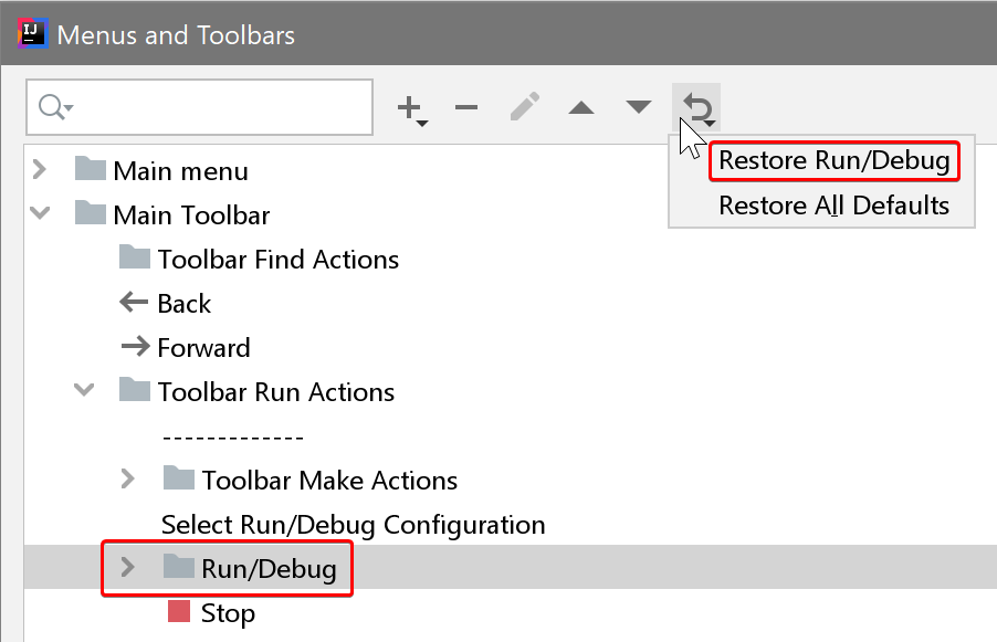 在我的例子中,在从IDEA 2019.2升级到2019.3之后,所有项目的Run/Debug按钮都消失了。尝试检查源代码根,使缓存无效,运行/调试配置等等-没有成功。只有还原Run/Debug操作组才有帮助: