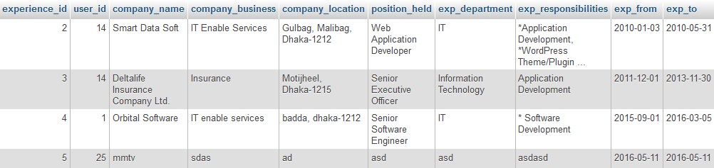 我想要计算每个特定用户id的总体验年和月。user_id在表中可以是多个,如下所示。在这里,user_id 14的总经验范围将是2010-01-03至2013年- 11 -30,预期结果将是3年11个月。我如何在php或mysql中做到这一点?