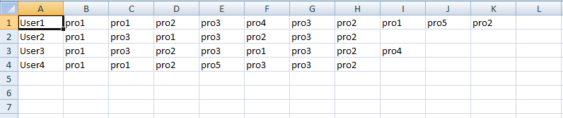 user1 | pro1 | pro1 | pro2 | pro3 | pro4 | pro3 | pro2...