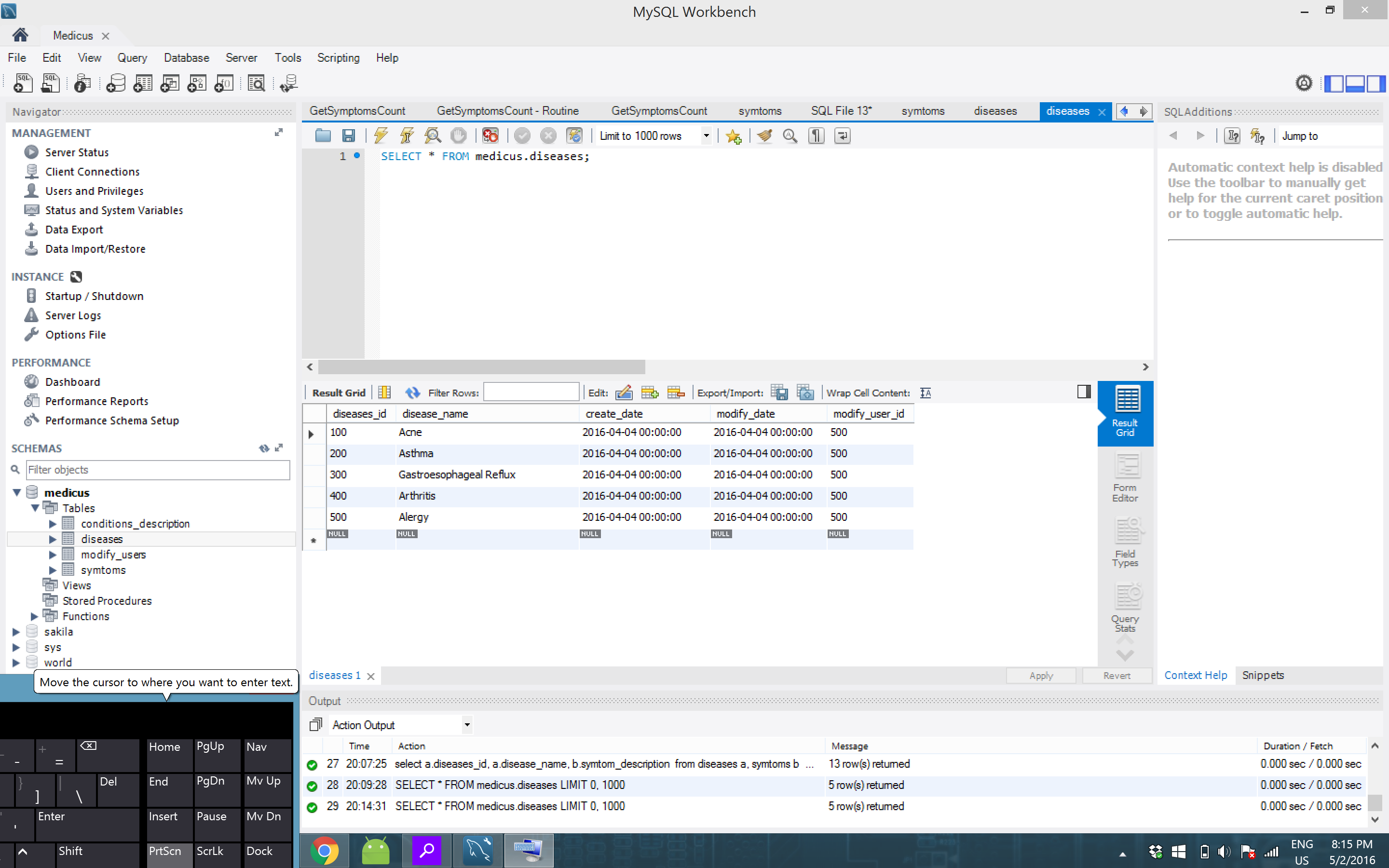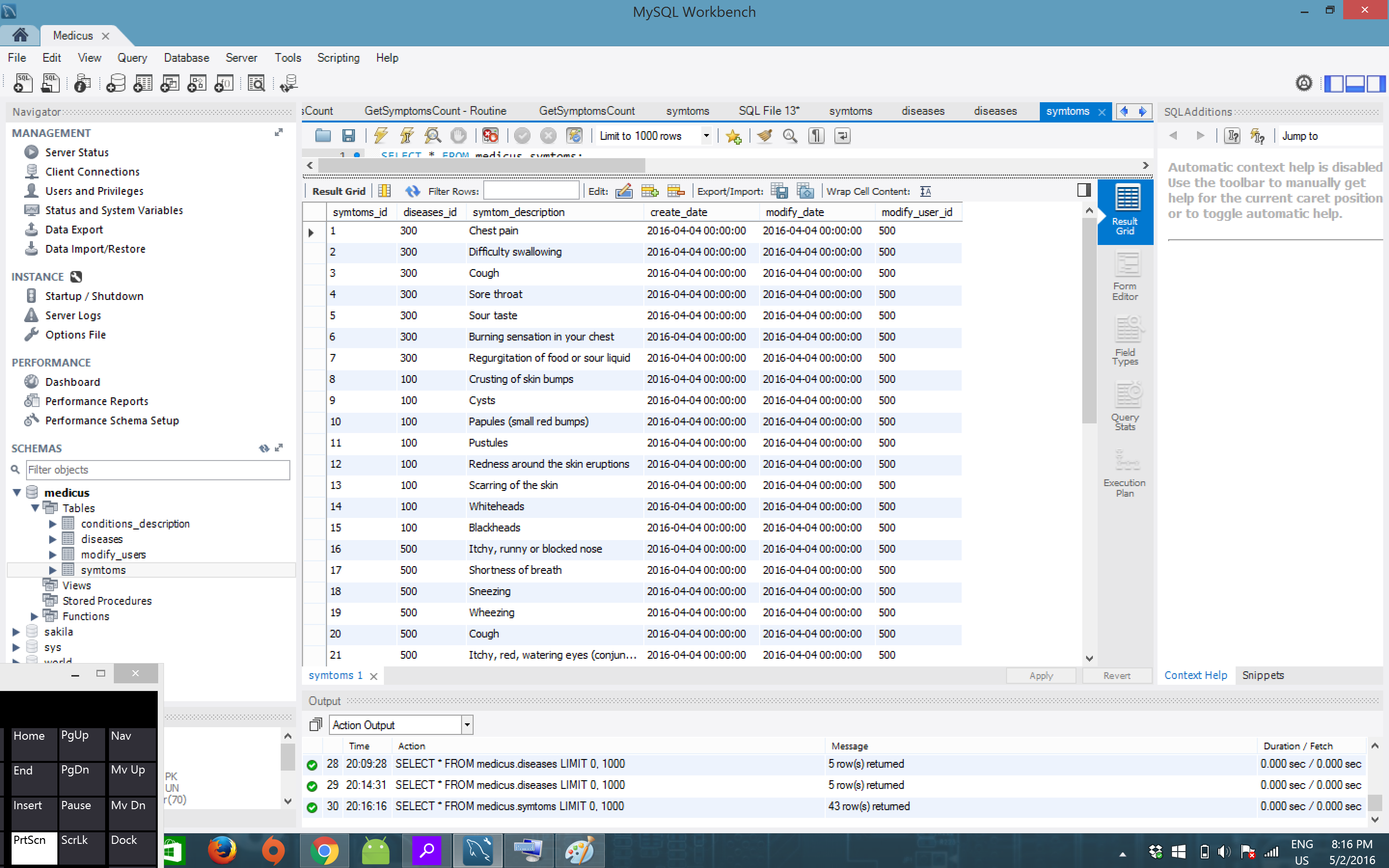 我想做的是,当用户输入一个症状时,它会遍历疾病表,找出与它相关的匹配症状,然后返回给出症状的疾病。
