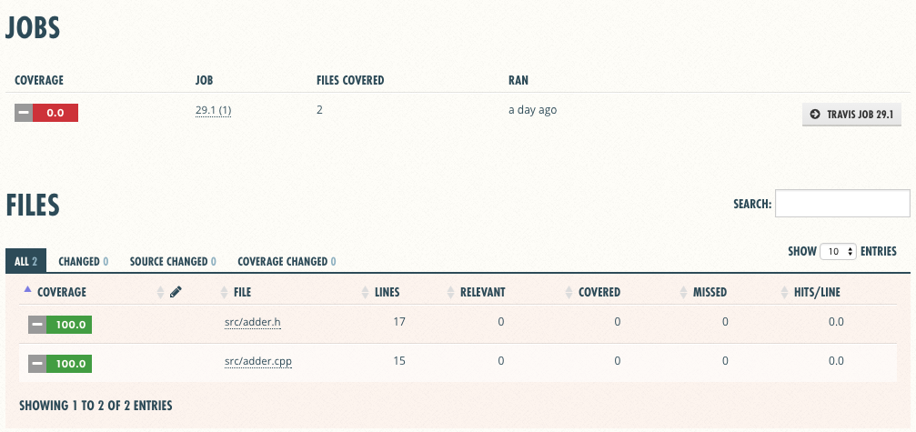 我做了一个简单的C++项目,我连接到特拉维斯和工作服。据我所知,我上传的报告是正确的,因为我的源文件显示在工作服和100%覆盖。