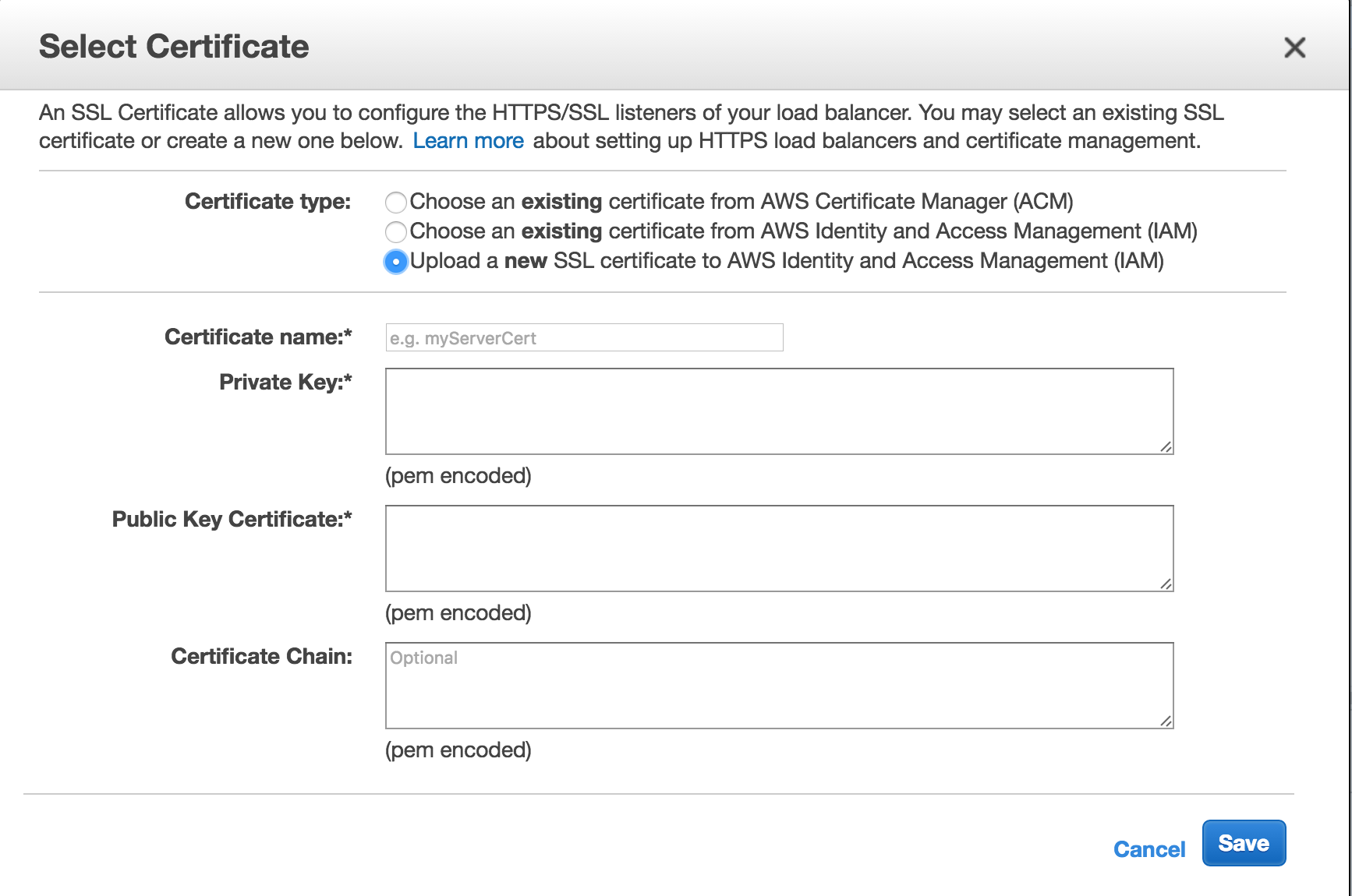 我使用AWS负载均衡器在端口433配置一个侦听器,并使用之前生成的SSL证书在这种弹出窗口中导入: