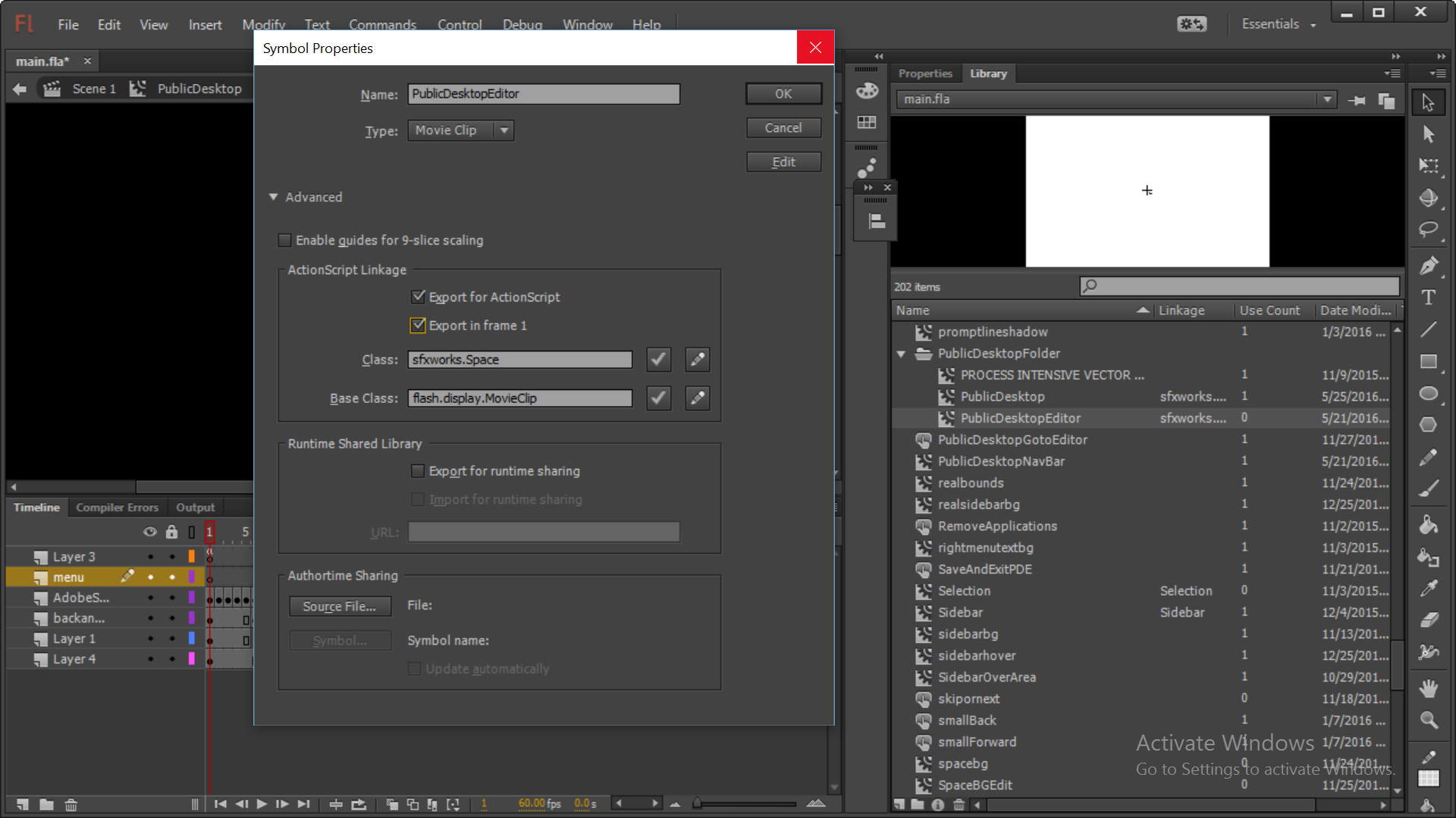 您需要将场景( Adobe中的库中的对象(或者Adobe动画中的对象)链接到您的类中。(为Actionscript导出),但是(这里是kicker),您还需要检查框架1的导出,并确保它已加载到框架1上。