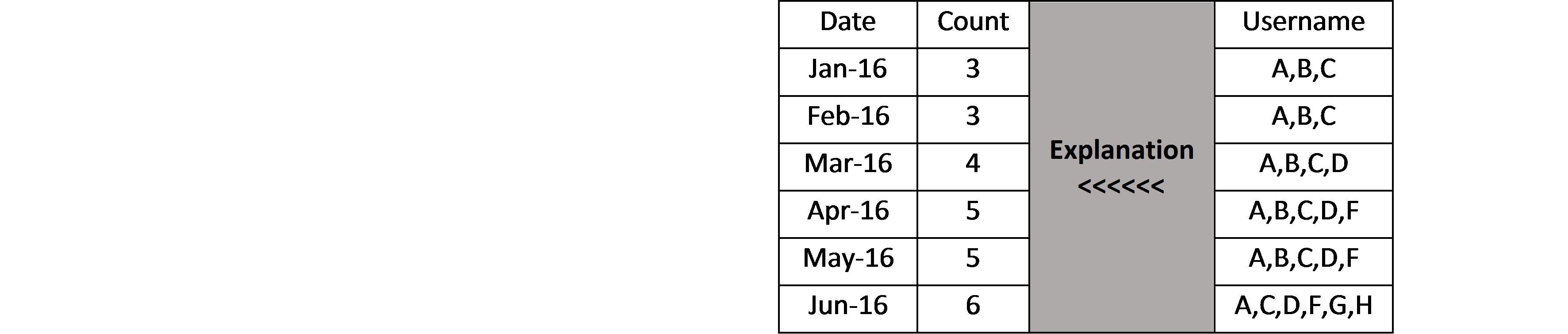 Date    Username 1/1/2016    A 1/1/2016    B 1/2/2016    C 2/1/2016    A 2/1/2016    B 2/2/2016    B 3/1/2016    B 3/1/2016    C 3/2/2016    D 4/1/2016    A 4/1/2016    C 4/2/2016    D 4/3/2016    F 5/1/2016    D 5/2/2016    F 6/1/2016    D 6/2/2016    F 6/3/2016    G 6/4/2016    H