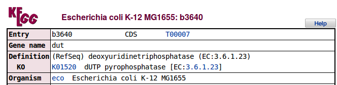 U‘’cnb:‘cnb 3640\胸腺肽蛋白;K06316寡糖易位蛋白RFT1\ncgi:CGB_B3640C\thypothetical蛋白\neco:b 3640\tdut;脱氧尿嘧啶三磷酸酶(EC:3.6.1.23);K01520 dUTP焦磷酸酶EC:3.6.1.23\nsea:SeAg_B3640\tbfd;细菌铁蛋白相关铁氧还蛋白;K02192细菌铁蛋白相关铁氧还蛋白:nyps 3640\保守假想protein\nreu:Reut_B3640\tconserved假想蛋白\nbbr:EC 3640\tphage相关蛋白出口蛋白\nmag:nmag 3640\胸腺嘧啶核苷钩相关蛋白;K02407鞭毛钩相关蛋白2\ncbi:CLJ_B3640\tconserved假想蛋白;K09963未表征蛋白\nmmo:nmmo 3640\胸腺蛋白\nmbo:mb3640ctftsH;膜结合蛋白酶FTSH (细胞分裂蛋白) (EC:3.4.24.-);K03798细胞分裂蛋白酶FtsH EC:3.4.24.