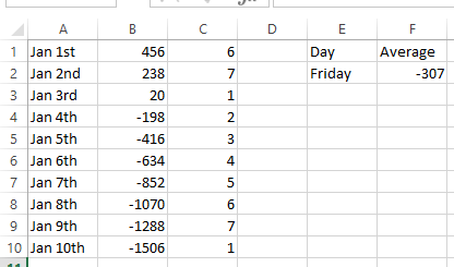 =IFERROR(AVERAGEIF($C$1:$C$10,MATCH(E2,{"Sunday","Monday","Tuesday","Wednesday","Thursday","Friday","Saturday"},0),$B$1:$B$10),"")概念证明
