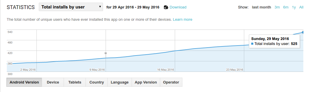 我在游戏商店有个应用程序。我最近完成了该应用程序的500次下载。Google Play Developer控制台显示,截至2天前(5月29日),有525个安装: