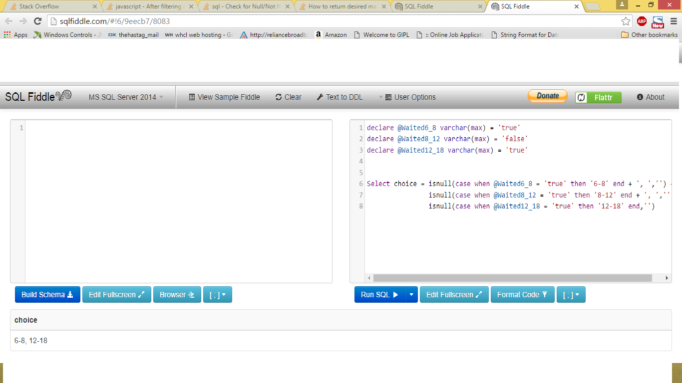 Select choice = isnull(case when @Waited6_8 = 'true' then '6-8' end + ', ','') +
