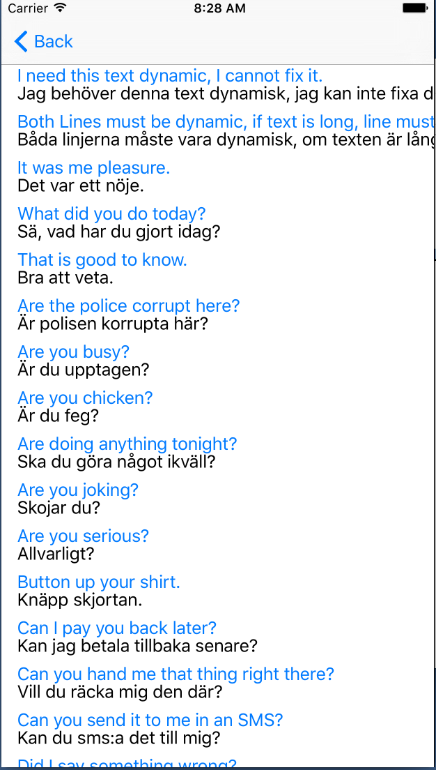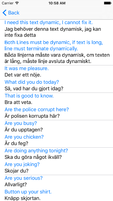 我正在尝试为Swift/IOS实现一个英语到瑞典的学习应用程序--我想有两个动态行,数据来自数组,我尽了最大的努力来解决它。我看过大概。所有堆栈溢出链接也一样,但根本没有成功。看截图,因为文字是长的,我不能在屏幕上看到它,文本也不会出现在第二行。当我添加任何约束时,这两行有时会消失,或者只有一行出现。