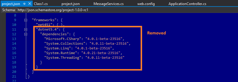 非常感谢你们的帮助。我设法将dotnet5.4框架从project.json文件中删除,从而使其正常工作。见下面的截图