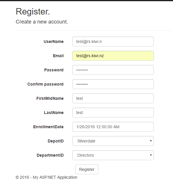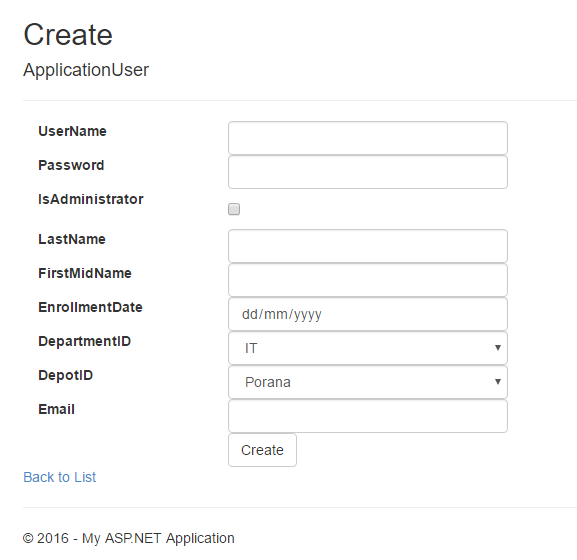 public ActionResult Create([Bind(Include = "Id,IsAdministrator,LastName,FirstMidName,EnrollmentDate,DepartmentID,DepotID,Email,EmailConfirmed,PasswordHash,SecurityStamp,PhoneNumber,PhoneNumberConfirmed,TwoFactorEnabled,LockoutEndDateUtc,LockoutEnabled,AccessFailedCount,UserName")] ApplicationUser applicationUser)